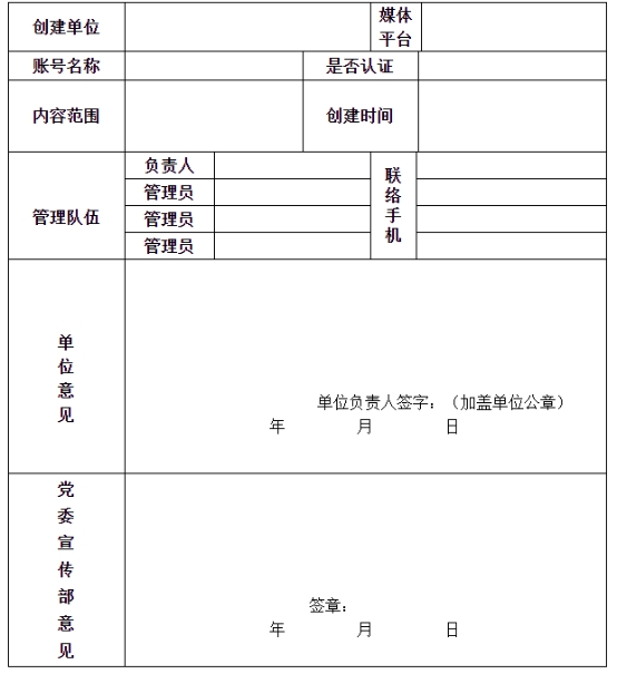 第五条因工作需要在提供相关服务的新媒体平台上开设账户和发布内容的部门、单位,无论是否得到平台认证,均须在创建前向党委宣传统战部报批;在创建后五个工作日内,向党委宣传统战部申报备案。党委宣传统战部负责建立完整规范的档案。