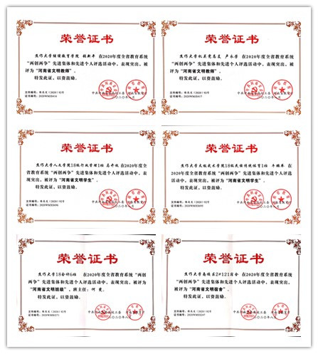 近日,中共河南省委高校工委、河南省教育厅印发《关于公布2020年度全省教育系统“两创两争”活动先进集体和先进个人评选活动的通知》(豫高发﹝2020﹞92号),对2020年度全省教育系统“两创两争”活动先进集体和先进个人进行表彰。我校继续教育学院张新平、机关党总支卢永芳荣获“河南省文明教师”荣誉称号,人文学院18级行政管理1班马开放、太极武术学院18级民族传统体育1班牛鹏举荣获“河南省文明学生”荣誉称号,南校区2#121宿舍荣获“河南省文明宿舍”荣誉称号,18会计6班(班主任:何斐)荣获“河南省文明班级”荣誉称号。